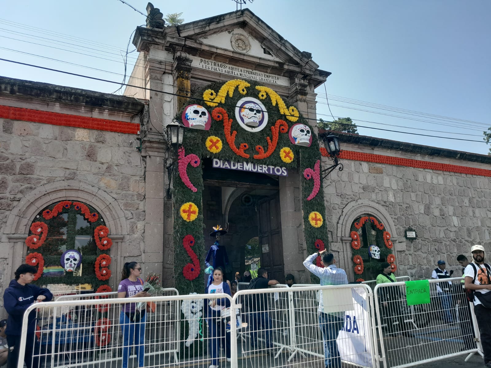 En el panteón municipal de Morelia, escenario de estas visitas anuales para conmemorar la tradición y acompañar a quienes partieron primero, hay un camino de cempasúchil y es un escenario que recibe a los dolientes con un par de catrinas gigantes que al ingreso nos recuerdan la tradición pero también la muerte.