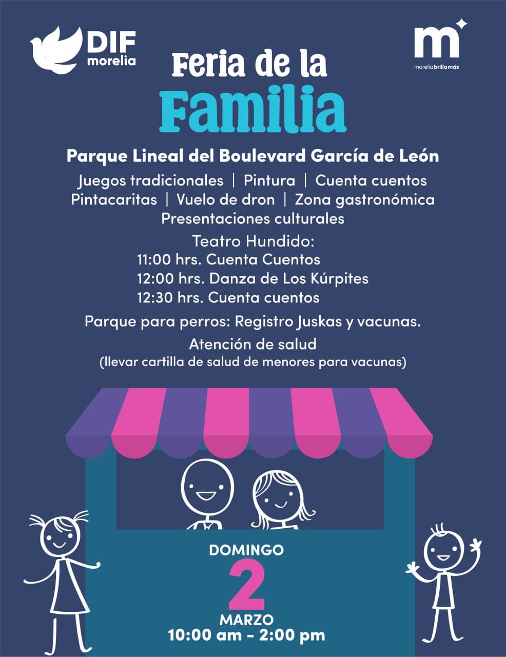 Morelia, Michoacán.– Con el compromiso de fortalecer la convivencia familiar y fomentar espacios de recreación para todas y todos, el DIF Morelia, que encabeza la Presidenta Honoraria, Paola Delgadillo Hernández, invita a la ciudadanía a participar en la Feria del Día de la Familia que se llevará a cabo este domingo 2 de marzo de 10 am a 2 pm en el Parque Lineal del Boulevard García de León.