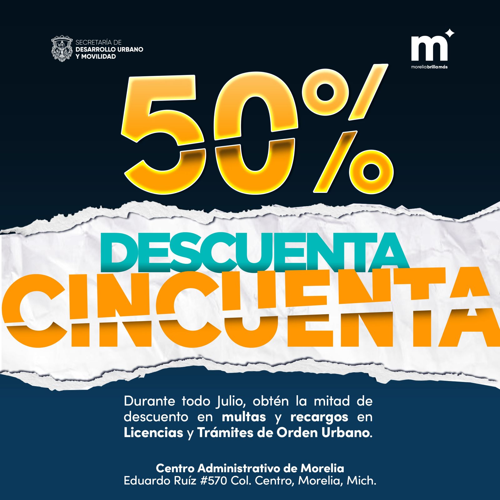 Con el objetivo de apoyar a la ciudadanía y facilitar la regularización de trámites, el Gobierno de Morelia bajo las instrucciones del presidente Alfonso Martínez Alcázar, lanza “¡Descuenta 50%!”, una campaña especial de condonación de recargos y multas, que estará vigente del 1° al 31 de julio de 2025, dirigida a personas que tengan adeudos en tres rubros importantes: trámites urbanos, construcción o vivienda, y licencias de funcionamiento.