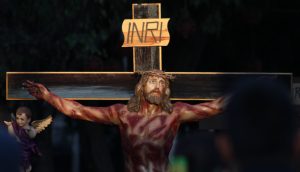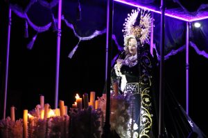 El escenario que se utilizó para las escenificaciones de la Pasión y Muerte de Jesús que se habían llevado a cabo al mediodía sirvió para que el Arzobispo Carlos Garfias Merlos y autoridades municipales realizarán el tradicional pésame de la virgen y el pasar de cada cofradía.