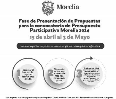 El ayuntamiento de Morelia informa que del 15 de abril al 03 de mayo se llevará a cabo el proceso de presentación de propuestas de los proyectos ciudadanos.