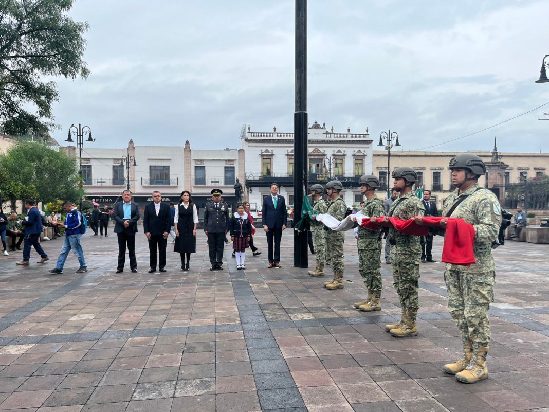 En la plaza Melchor Ocampo, el alcalde Alfonso Martínez encabezó los honores a la bandera que fueron acompañados por personal y la Banda de Guerra del 12/o Batallón de Infantería de la 21/a Zona Militar, fue izada la bandera en dicha plaza.