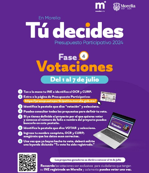 Recordar que solo podrán votar una sola vez y lo podrán hacer todos los ciudadanos con credencial de elector de Morelia o que cuenten con una carta de residencia de la ciudad, expedida por la Secretaría del Ayuntamiento.