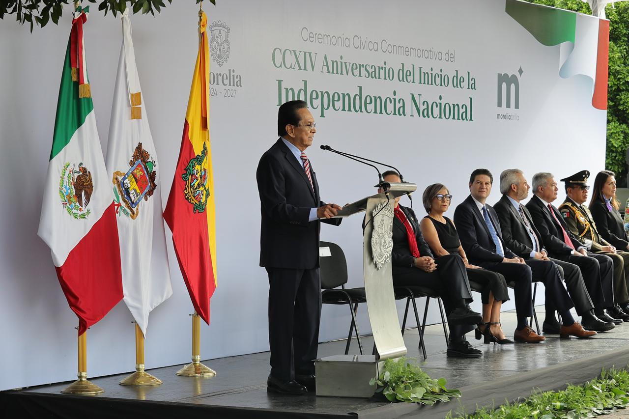 Para alcanzar el anhelo de una patria justa y equitativa es fundamental respetar la democracia, la división de Poderes y los derechos humanos, señaló Víctor Manuel Tinoco Rubí, exgobernador de Michoacán y orador oficial de la conmemoración del 214 Aniversario de la Independencia de México celebrado por el Gobierno de Morelia.