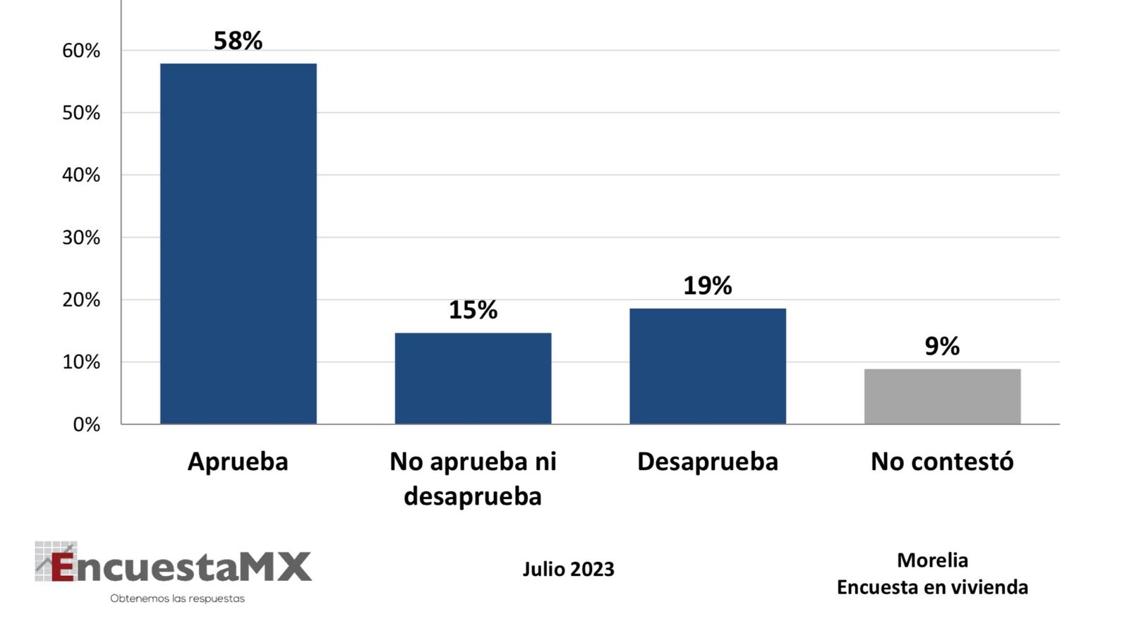 De acuerdo a la encuesta, Alfonso Martínez, tiene un 58 por ciento de aprobación; calificación promedio de 6.1; el 84 por ciento de los morelianos lo conocen y consideran que es el más capaz para resolver los problemas del municipio.