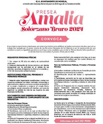 El Gobierno de Morelia, a través del Instituto de la Mujer Moreliana para la Igualdad Sustantiva (IMMUJERIS), convoca a las mujeres morelianas y mexicanas, así como a las instituciones públicas, privadas o personas morales, que con su trabajo han luchado por el pleno respeto de los Derechos Humanos de las Mujeres y por la construcción de una sociedad con justicia e igualdad, a participar como candidatas para recibir la “Presea Amalia Solórzano Bravo” 2024.