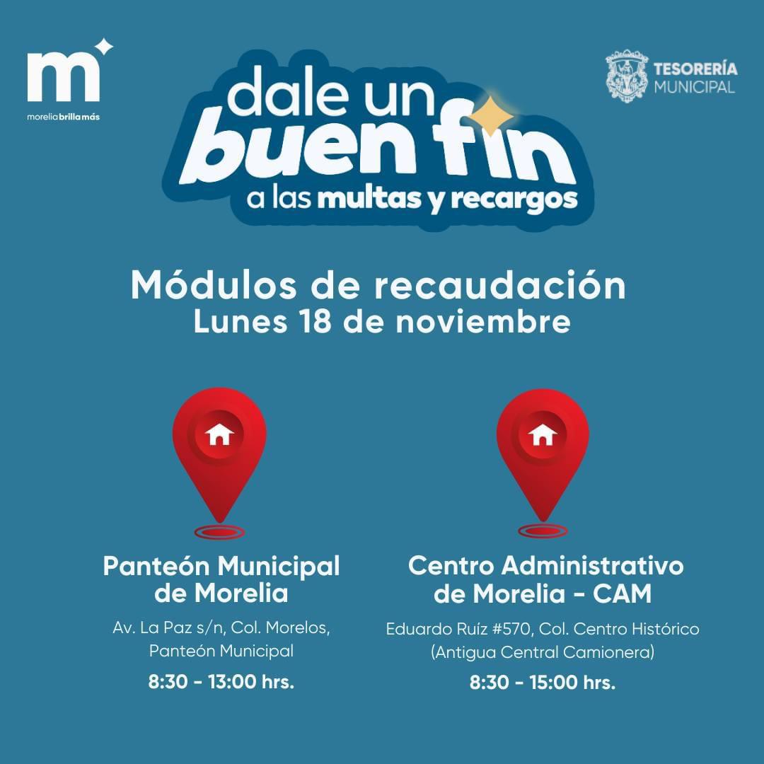 Morelia, Michoacán.- El Gobierno de Morelia ampliará el servicio de recaudación durante este lunes en el Centro Administrativo de Morelia y el Panteón Municipal con el objetivo de que más morelianas y morelianos se beneficien de los descuentos del Buen Fin en multas y recargos a impuestos municipales.