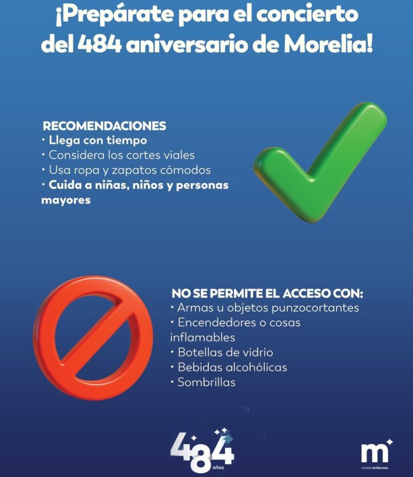 Con el objetivo de que todos y todas disfruten de manera segura y ordenada el concierto gratuito por el 484 Aniversario de Morelia, el Gobierno Municipal encabezado por el presidente Alfonso Martínez Alcázar, informa los objetos prohibidos en el evento, a la par que emite recomendaciones para vivir una mejor experiencia.