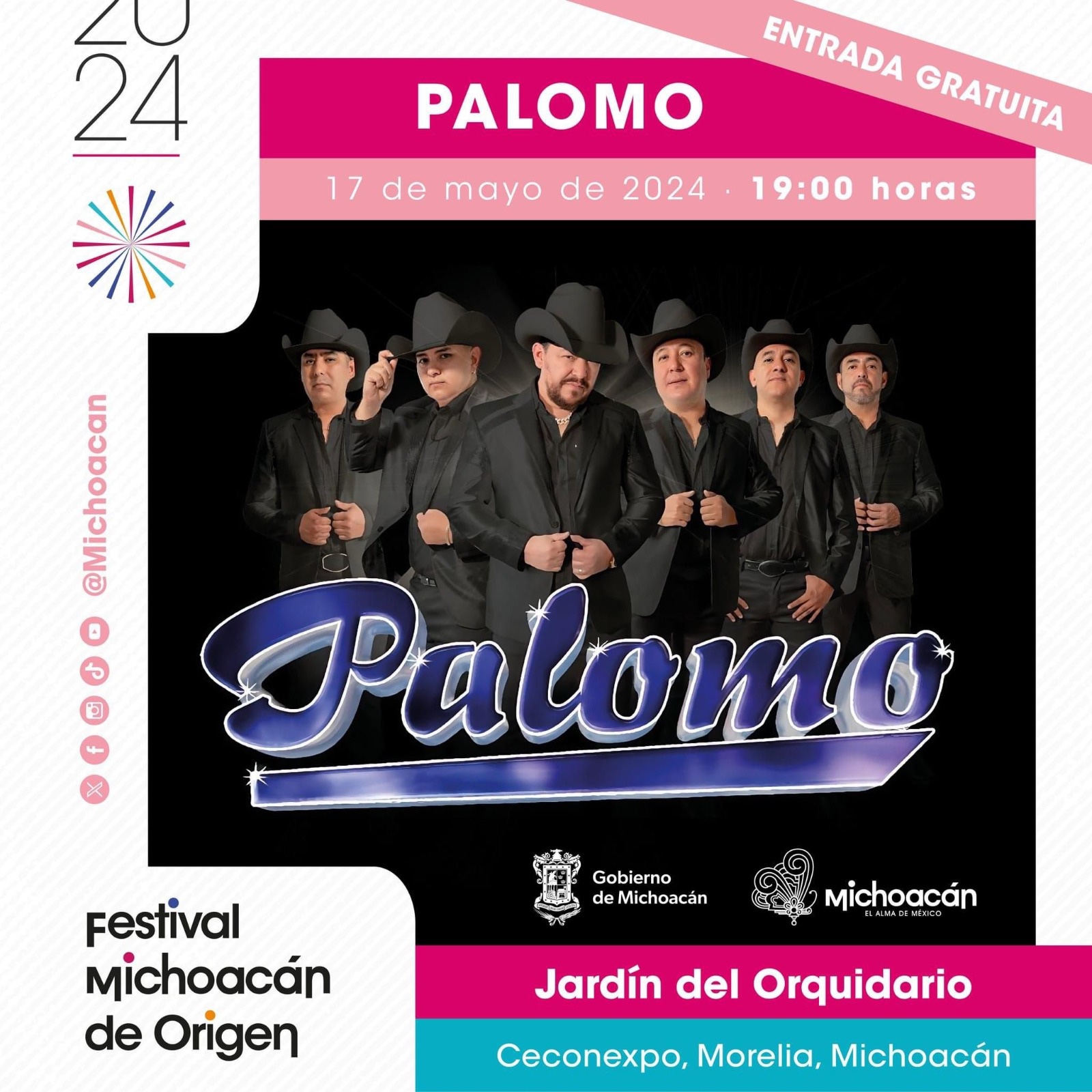 Grupo Palomo llega gratis este viernes 17 de mayo al Festival Michoacán de Origen (FMO) para marcar el inicio de la parte final de la edición 2024 de este evento 100 por ciento familiar, que desde el pasado 26 abril ha llenado de unión, sana convivencia y entretenimiento a michoacanos, turistas y visitantes.