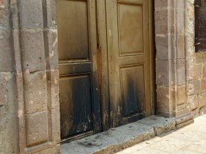 Se está investigando para identificar a la persona que prendió fuego a la puerta del templo de la Columna, señaló Pablo Alarcón, comisario de Morelia.