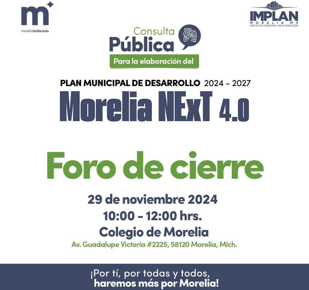 El Presidente Municipal de Morelia, Alfonso Martínez Alcázar a través del Instituto Municipal de Planeación (IMPLAN), invita a las morelianas y morelianos a participar en el Foro de Cierre del Plan Municipal de Desarrollo 2024-2027 “Morelia Next”, que se realizará el próximo 29 de noviembre en el Colegio de Morelia, a partir de las 10 de la mañana.