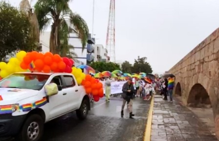 La impuntualidad hizo que les alcanzase la lluvia y, así, unos a pie y otro en vehículos diversos desde motos, camiones, plataformas de trailers y hasta el Turibus de Turismo adornados con globos de colores, todos los reunidos que se agrupan bajo la bandera multicolor iniciaron su paso por la Avenida Acueducto para ir doblando después por la fuente de Las Tarascas rumbo al Centro histórico, en lo que ha sido el día de lo que ellos llaman el PRIDe o el orgullo, sin especificar de qué se enorgullecen, pero defendiendo quienes son.