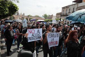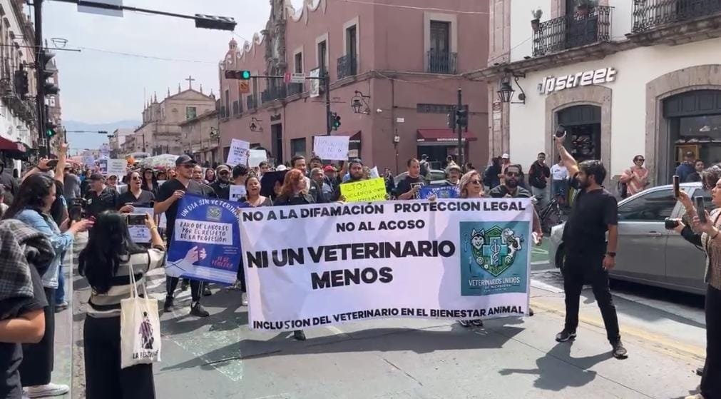 Cerca de 400 personas entre médicos veterinarios y alumnos de la carrera de médico veterinario zootecnista, algunos incluso acompañados de sus perritos, marchan aquí en Morelia contra la violencia. «Ni un veterinario menos» es uno de los clamores centrales y alto a la violencia de que son objeto.
