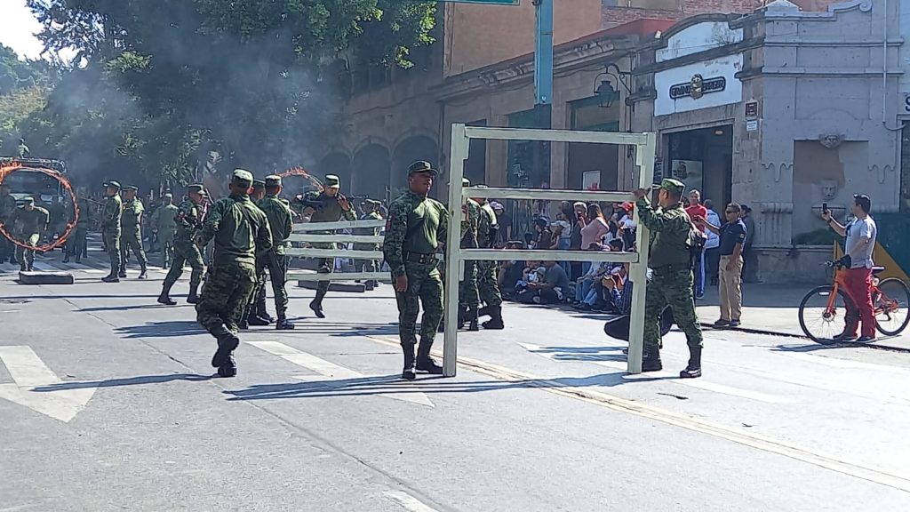 Después hicieron su aparición en este desfile los muchachos del Cecytem que tiene 93 planteles en 54 municipios. Todos los estudiantes de estas instituciones marcharon ejecutando tablas rítmicas y diversas suertes como pirámides justo a su paso bajo el balcón de Palacio donde presenciaba el gobernante Alfredo Ramírez Bedolla, y los titulares de los Poderes Legislativo y Judicial.