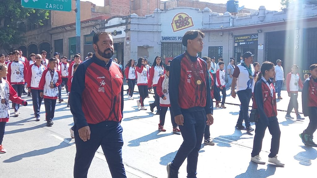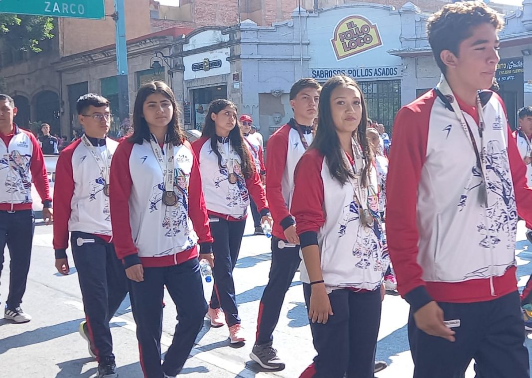 Enseguida un nutrido contingente de deportistas michoacanos de diferentes disciplinas, entre ellos los jóvenes que han representado a Michoacán en competencias deportivas nacionales e internacionales, quienes orgullosos portaban sus medallas en el pecho.