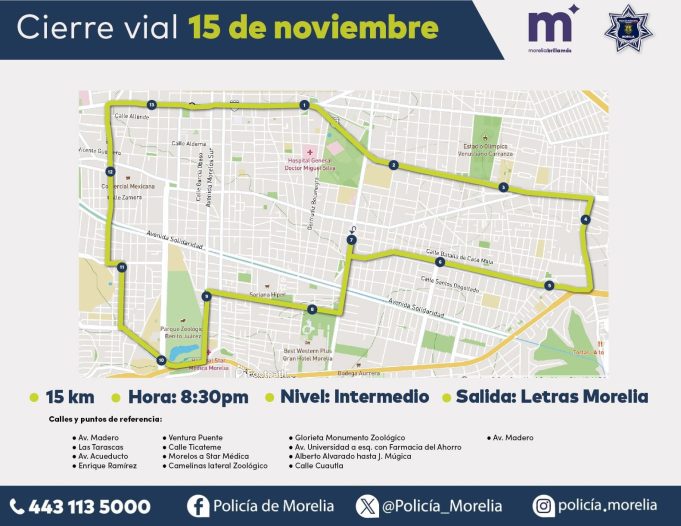 Por lo anterior, el Gobierno Municipal, a través de la Policía Morelia, anuncia cortes viales sobre las siguientes rutas, mismos que serán momentáneos ya que la circulación se liberará una vez que avance el grupo de patinadores: