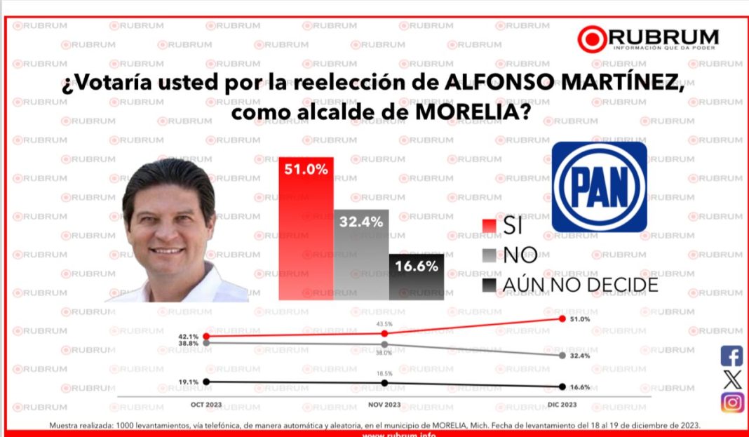 De acuerdo al más reciente estudio de Rubrum, publicado en su sitio oficial, el 51% de las personas encuestadas votarían por Alfonso Martínez para que se mantenga gobernando un periodo más al frente de Morelia.