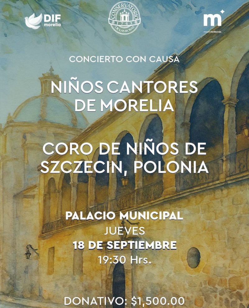 Paola Delgadillo Hernández, presidenta honoraria del DIF Morelia, con el respaldo del presidente municipal, Alfonso Martínez Alcázar, anuncia el concierto con causa que se celebrará el jueves 18 de septiembre a las 19:30 horas en el Palacio Municipal, con la participación de dos agrupaciones corales de gran prestigio: los Niños Cantores de Morelia y el Coro de Niños de Szczecin, Polonia.