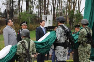 En ese sentido, los alumnos de las escuelas: Primaria «20 de Noviembre» y Secundaria Federal No.08, pudieron presenciar el izamiento de bandera a cargo del personal castrense que encabezó el Coronel Carlos Alberto Thompson Ehuan, Comandante de 26 Batallón de Guardia Nacional en Zacapu, Michoacán, y el Teniente Coronel de Infantería Héctor Valdez Contreras, segundo comandante del 12/o. Batallón.