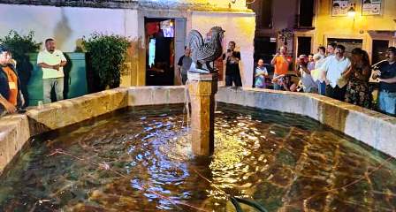 La escultura del gallo de cantera negra regreso a la famosa Pila del Gallo, tras varios años en que fue sustituida por una escultura metálica.