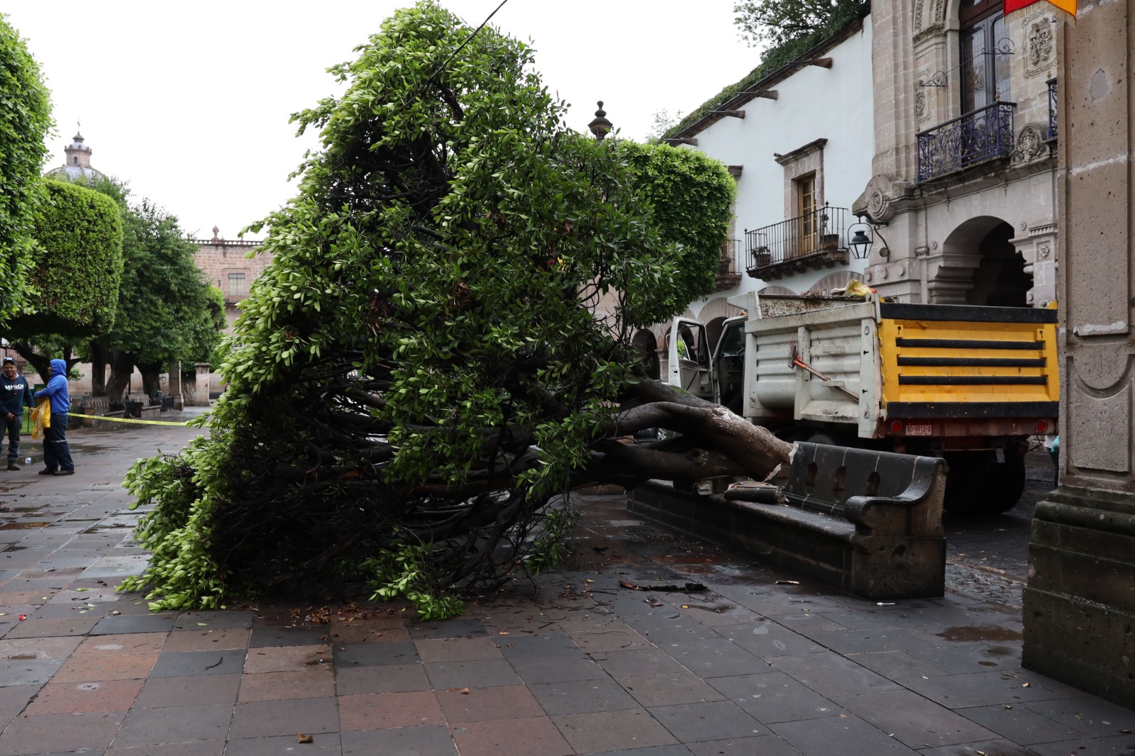En un primer punto, se reportó la caída de un árbol en la Plaza de Armas, lo que ocasionó daños a una banca de cantera. De inmediato, trabajadores municipales se trasladaron al lugar para realizar el retiro del árbol y acordonar la zona, con el apoyo de Policía Morelia, garantizando la seguridad de los transeúntes.