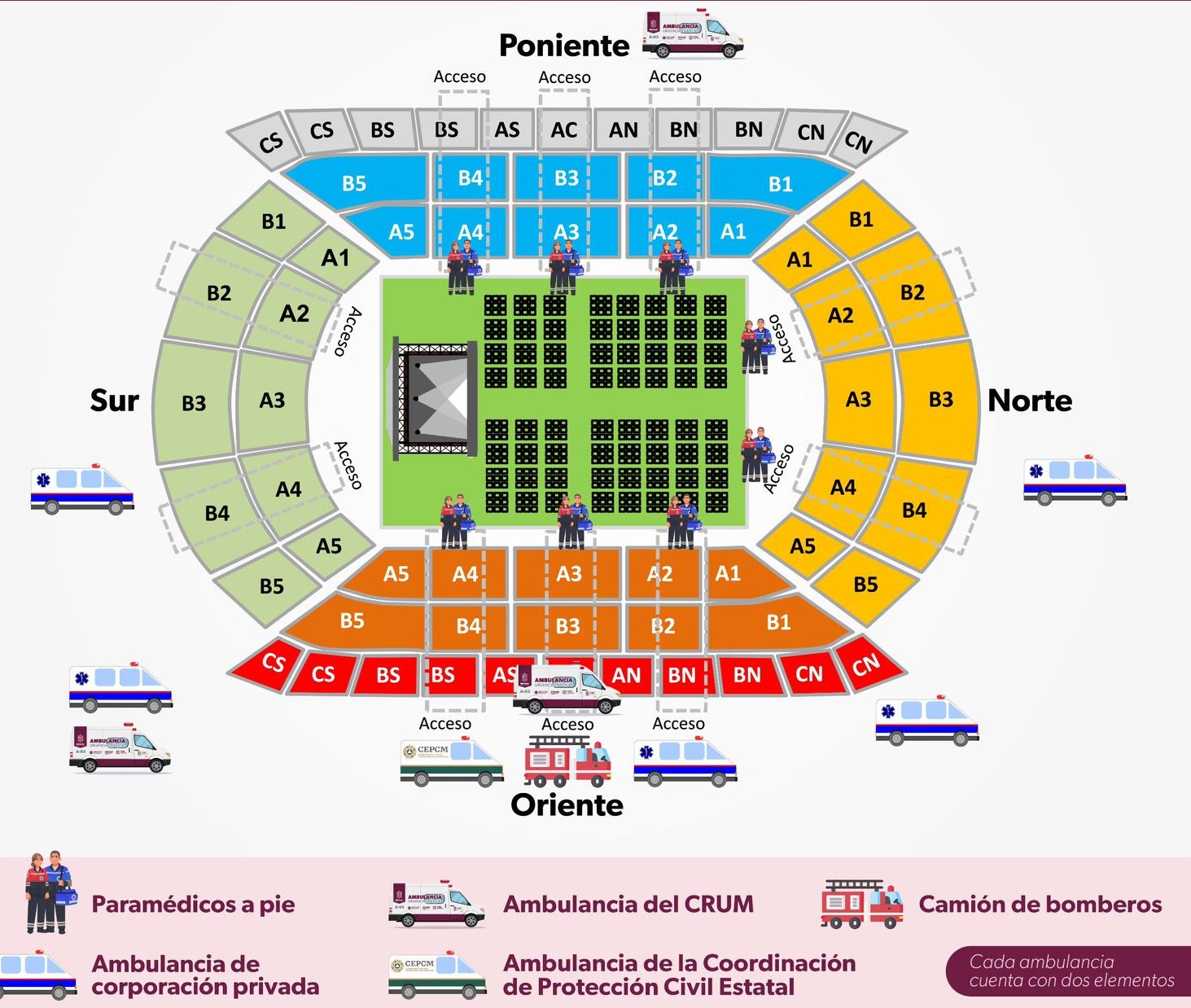Se instalarán puestos de socorro y primeros auxilios en los cuatro accesos del Estadio Morelos, y en el interior se colocarán seis brigadas de paramédicos a ras de cancha, dotados de equipamiento para atender colapsos nerviosos, caídas, luxaciones de tobillos, entre otros. Las unidades cuentan con instrumental de terapia intensiva, atención a infartos, por citar algunos ejemplos.