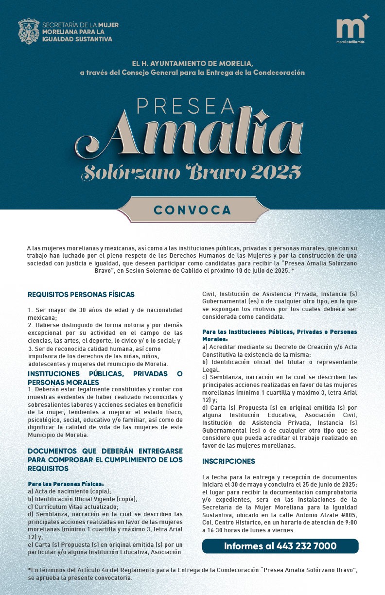 Morelia, Michoacán. – El Gobierno de Morelia, a través de su Secretaría de la Mujer Moreliana para la Igualdad Sustantiva (Semmujeris), recuerda a la ciudadanía que está por cerrar la convocatoria para recibir postulaciones a la Presea “Amalia Solórzano Bravo” 2025, que reconoce el trabajo de mujeres e instituciones que han contribuido a la defensa de los derechos de las mujeres y la construcción de una sociedad más justa e igualitaria.