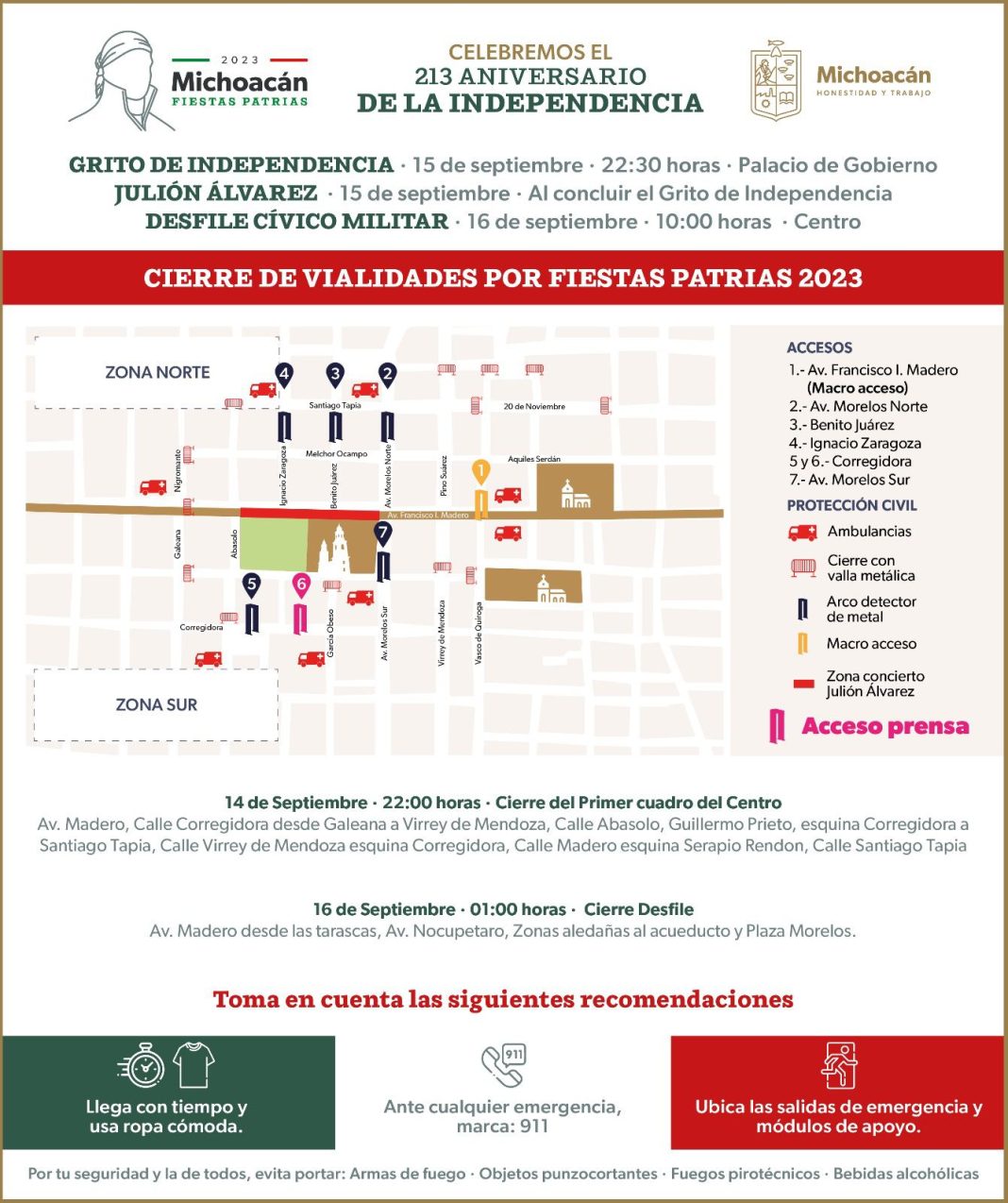 Con motivo de las fiestas patrias, a partir de las 22:00 horas de este jueves 14 de septiembre, se habilitarán siete accesos para ingresar al Primer cuadro del Centro Histórico de Morelia, a efecto de preservar la seguridad de la población que asiste a los festejos.