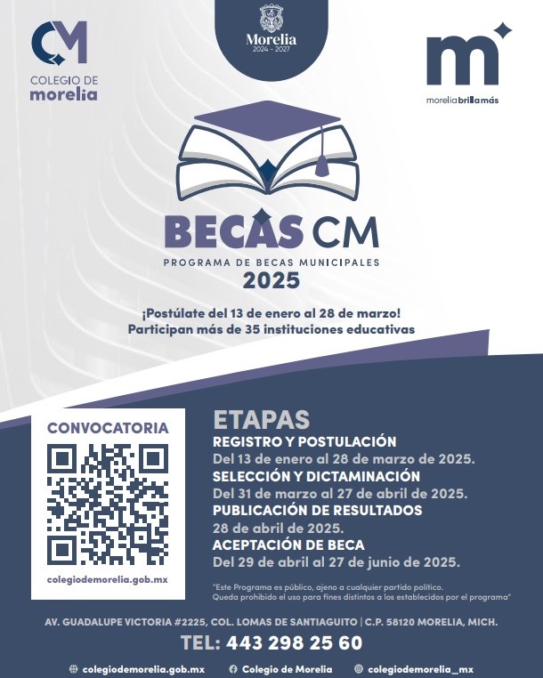 Finalmente, el titular del Colegio de Morelia destacó que los resultados de la convocatoria se darán a conocer el próximo 28 de abril, por lo que se invita a todas y todos los interesados a mantenerse atentos a través de la página oficial de la paramunicipal en: https://colegiodemorelia.gob.mx/