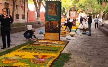 Los tapetes florales adornan el extenso camino de la Calzada Fray Antonio de San Miguel, escenario de continuas expresiones de arte, y le revisten de colorido a partir de este sábado.