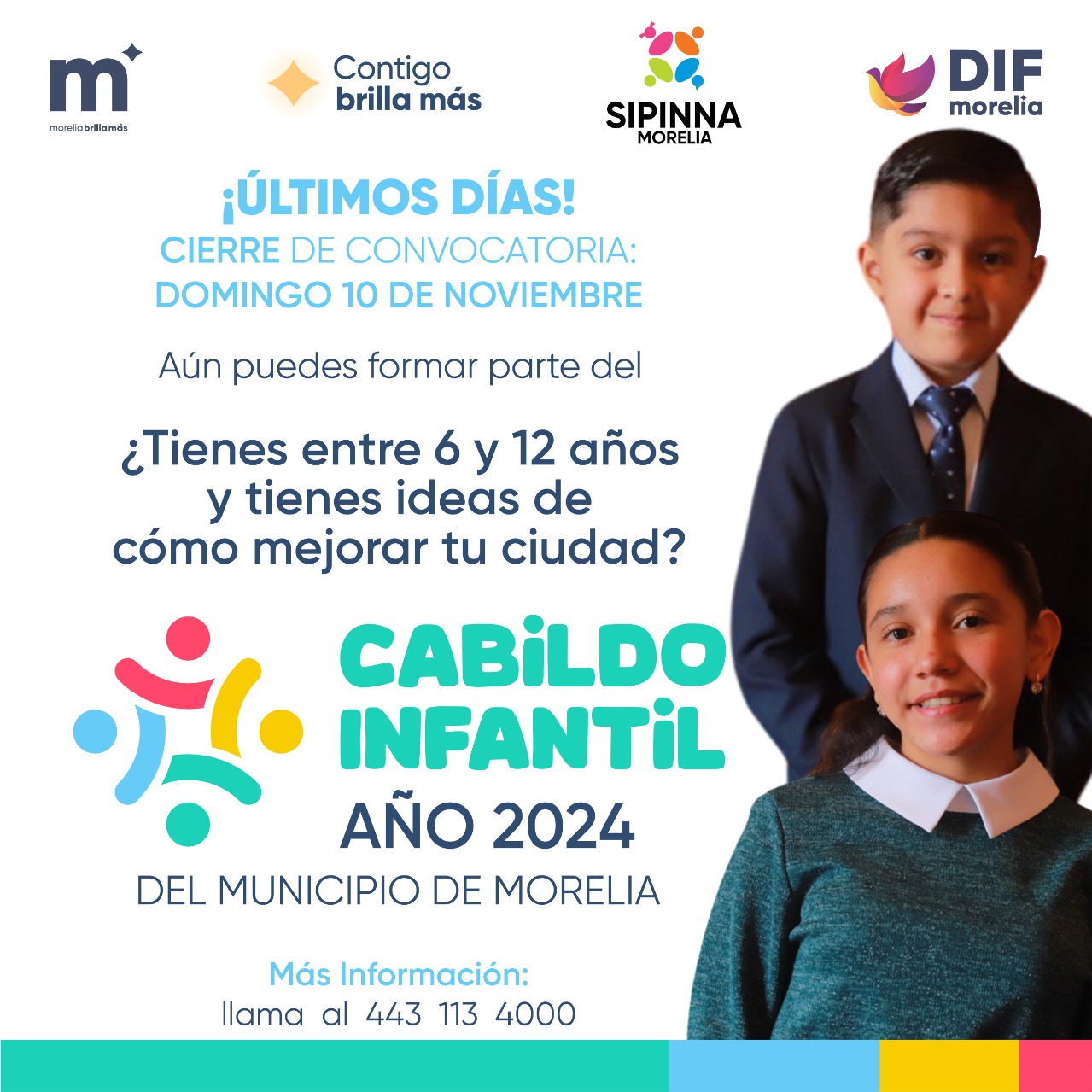El DIF Morelia, que encabeza la Presidenta Honoraria, Paola Delgadillo Hernández, recuerda a las familias morelianas que la convocatoria para el Cabildo Infantil 2024 estará abierta hasta el próximo domingo 10 de noviembre; esta iniciativa permite que niñas y niños de entre 6 y 12 años compartan sus propuestas para mejorar su ciudad y se involucren en la vida cívica desde una edad temprana.