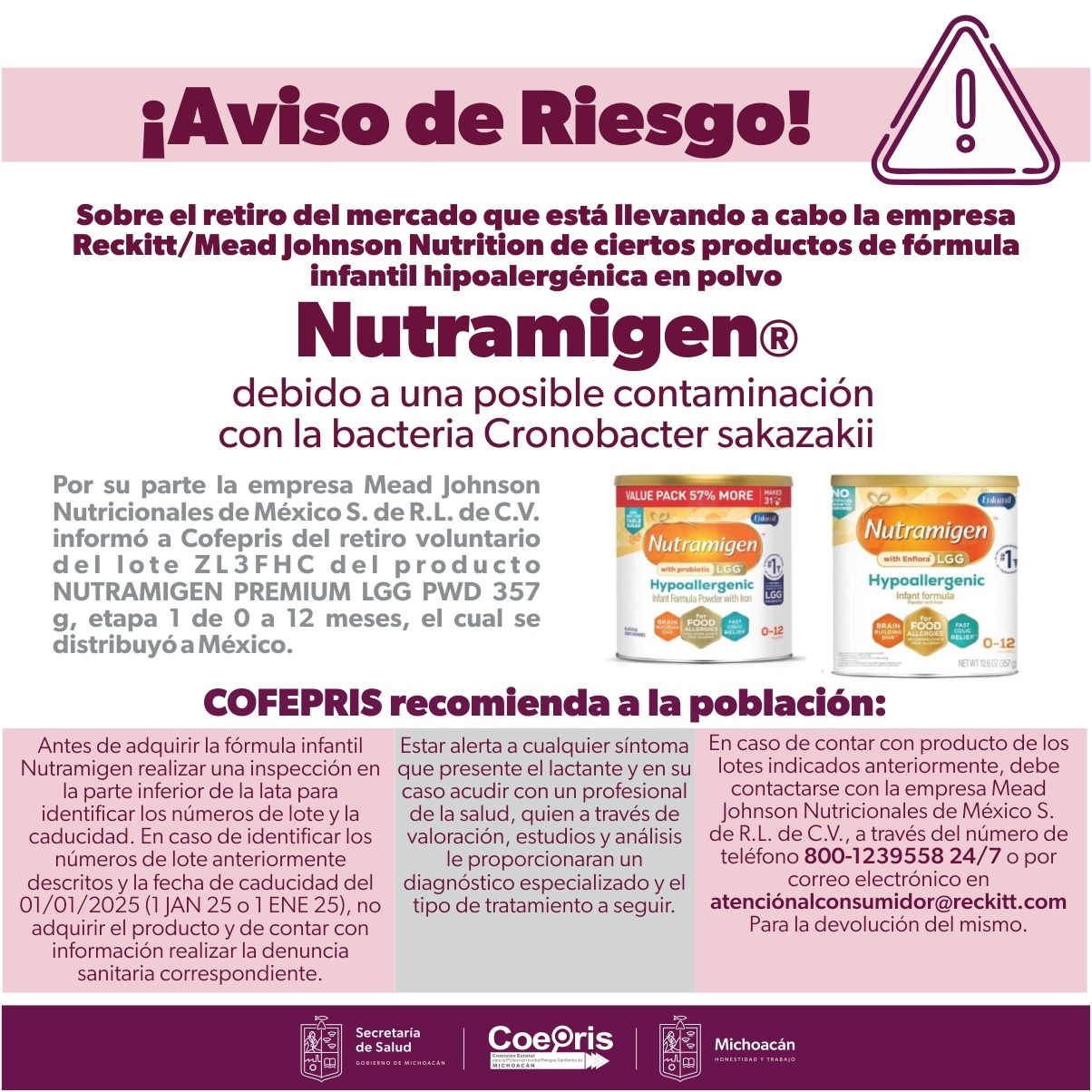 La Secretaría de Salud de Michoacán (SSM) a través de la Comisión Estatal para la Protección contra Riesgos Sanitarios (Coepris), alerta a la población sobre el retiro del lote ZLEFHC del producto Nutramigen Premium LGG PWD 357g, etapa 1 de 0 a 12 meses, el cual se distribuyó en México.
