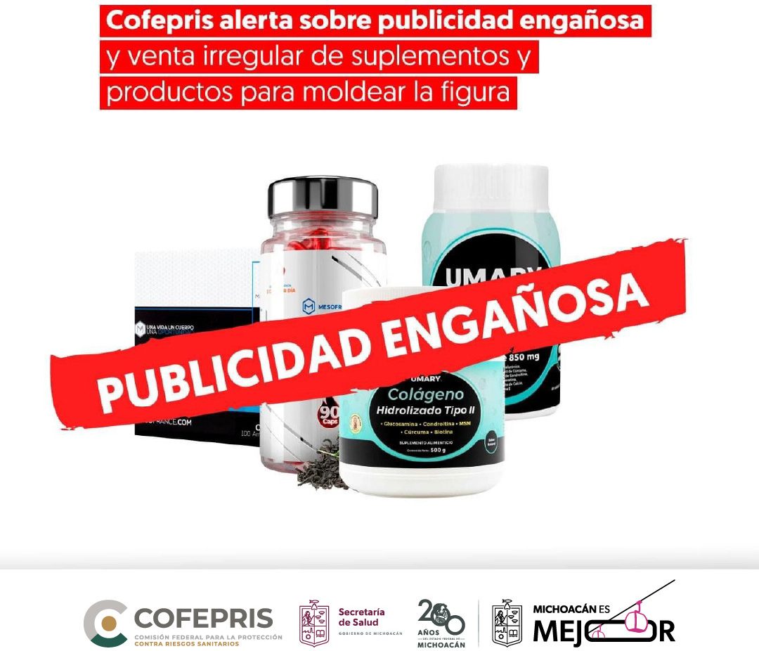 La Comisión Federal para la Protección contra Riesgos Sanitarios (Cofepris), a través de la Secretaría de Salud de Michoacán (SSM), alerta a la población sobre la publicidad engañosa y venta irregular de productos para perder peso, moldear la figura y rejuvenecer, de las marcas Umary y Mesofrance, ya que pueden provocar efectos adversos.