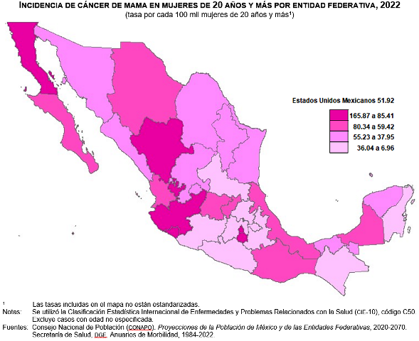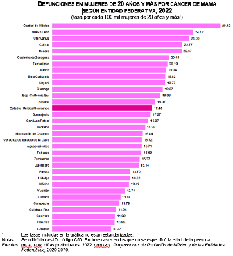 Por entidad federativa, para 2022, las tasas más altas de defunciones por cáncer de mama para mujeres de 20 años y más se observaron en Ciudad de México (29.42), Nuevo León (24.72) y Chihuahua (24.00). Chiapas (10.27), Tlaxcala (10.95) y Guerrero (11.02) fueron las entidades con las tasas de defunciones más bajas en el país por esta enfermedad, mientras que 19 estados reportaron tasas inferiores al valor nacional.