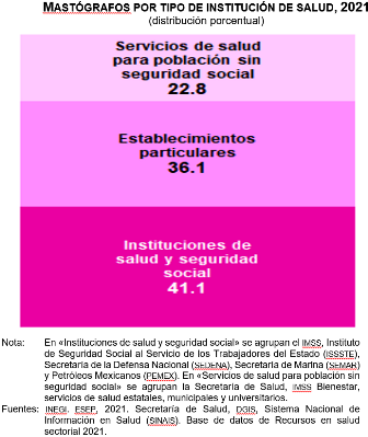 Por instituciones del sector público de salud, 55.9 % (583) del personal médico especializado en oncología se concentraba en la Secretaría de Salud, 22.6 % (236) en el IMSS, 9.8 % (102) en el ISSSTE, 4.6 % (48) en los servicios estatales de salud, 1.8 % (19) en los hospitales de PEMEX y 1.3 % (14) en las instalaciones médicas de la SEMAR.