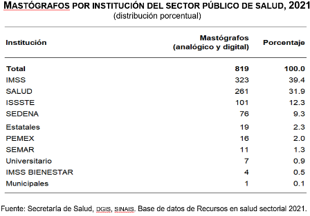 Respecto a la disponibilidad de mastógrafos en México, en 2021 se registraron mil 281 aparatos. De estos, 41.1 % (527) estaba en las «instituciones de salud y seguridad social»; 36.1 % (462), en «establecimientos particulares» y 22.8 % (292), en «servicios de salud para población sin seguridad social».