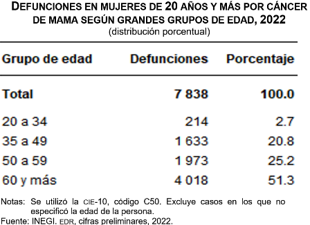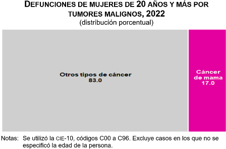 Al considerar únicamente las defunciones de mujeres de 20 años y más a causa de tumores malignos (45 mil 982), el porcentaje de muertes por tumor maligno de mama representó 17.0 % (7 mil 838) en 2022.
