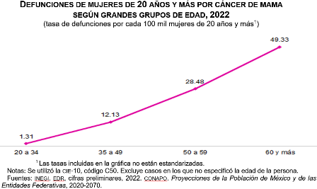 En 2022, a nivel nacional, el análisis de la proporción de defunciones de cáncer de mama en mujeres de 20 años y más, respecto a la población de mujeres en dicho rango de edad, muestra que la tasa de mortalidad fue de 17.48 muertes por cada 100 mil. Ahora bien, se replica el comportamiento por grupos de edad: conforme esta aumenta, también lo hace la mortalidad. La tasa más alta se observó en el rango de 60 años y más, con 49.33 defunciones por cada 100 mil mujeres en ese grupo de edad.
