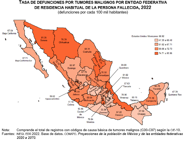 En 2022, las entidades federativas que registraron las tasas más altas de defunciones por tumores malignos fueron: Ciudad de México, Sonora, Veracruz de Ignacio de la Llave, Colima, Morelos y Chihuahua, con tasas de 76.39 a 95.96 defunciones por cada 100 mil habitantes. En contraste, las entidades con las tasas más bajas fueron: Quintana Roo, Guerrero, Chiapas, Tlaxcala, Puebla y Aguascalientes, con 47.39 a 59.62 defunciones por cada 100 mil habitantes.