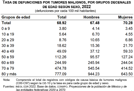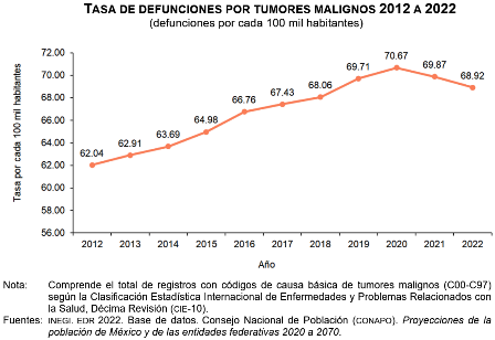 En 2022, en México se registraron 847 mil 716 defunciones: 10.6 % fue por tumores malignos (89 mil 574). La tasa de defunciones por esta causa aumentó de forma constante, al pasar de 62.04 defunciones por cada 100 mil personas en 2012, a 68.92 en 2022.