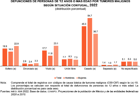 En 2022 se registraron 88 mil 538 defunciones por tumores malignos en personas con 12 años o más de edad. Al revisar su situación conyugal al morir, se identificó que 45.3 % (40 mil 108) estaba casado o casada; 19.9 % (17 mil 580) era soltero o soltera y 17.7 % (15 mil 680), viudo o viuda.