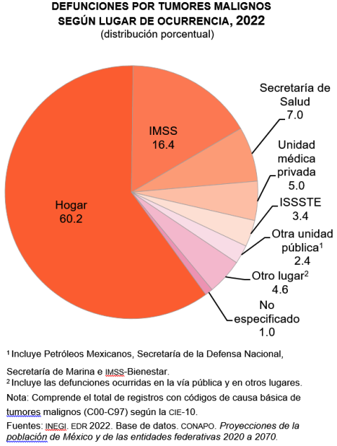 En 2022, de acuerdo con información que proporciona la EDR sobre el lugar de ocurrencia de la defunción, 60.2 % (53 mil 904) de los fallecimientos por tumores malignos ocurrió en el hogar de la persona; 16.4 % (14 mil 673) fue en instalaciones médicas del Instituto Mexicano del Seguro Social; 7.0 % (6 mil 292), en alguna unidad médica de la Secretaría de Salud y 5.0 % (4 mil 439), en alguna unidad médica privada.