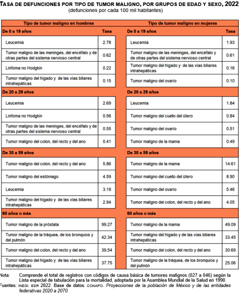 En la población de hombres entre 30 y 59 años, destacaron las defunciones por tumor maligno del colon, del recto y del ano, con una tasa de 5.86 defunciones. Siguió el tumor maligno del estómago, con una tasa de 4.59 por cada 100 mil. Entre las mujeres, la causa principal fue el tumor maligno de la mama, así como el tumor de cuello del útero. Las tasas fueron de 14.61 y 8.90 defunciones por cada 100 mil, respectivamente.