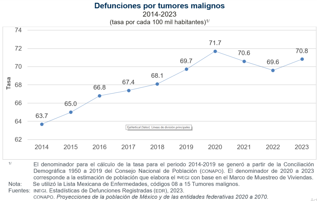Al analizar las muertes por cáncer respecto al total de la población en el último decenio, la tasa de defunciones tuvo su valor máximo en 2020, con 71.7 defunciones por cada 100 mil habitantes; en los siguientes 2 años se observó un ligero decremento y luego se volvió a incrementar para 2023.