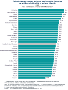 Por entidad federativa, Chihuahua (86.3) tuvo la tasa más alta de defunciones por tumores malignos, seguida por Baja California Sur (86.2) y Sonora (83.2). La entidad que presentó la tasa más baja fue Guerrero, con 51.1 defunciones por cada 100 mil habitantes, seguida por Tlaxcala (62.2) y Oaxaca (62.9).