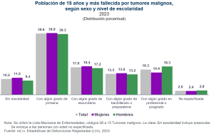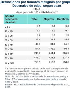 En 2023, se registraron 799 mil 869 defunciones, de las cuales 91 mil 562 (11.4 %) se debieron a tumores malignos. Según sexo, 47 mil 976 (52.4 %) fueron en mujeres y 43 mil 586 (47.6 %), en hombres.