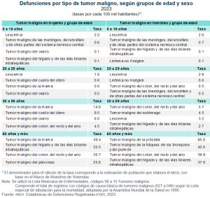 Algunos tumores malignos son la principal causa de muerte para determinados grupos de edad o afectaron de forma diferenciada a mujeres y hombres. En este contexto, la leucemia fue el cáncer con la mayor prevalencia entre la población de 0 a 29 años y presentó la tasa de mortalidad más alta (2.9) en los hombres de 20 a 29 años.