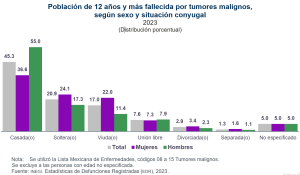En 2023, se registraron 90 mil 606 defunciones en personas con 12 años y más debidas a tumores malignos. Al revisar su situación conyugal al momento de fallecer, 41 mil 087 (45.3 %) estaba casada(o), 18 mil 924 (20.9 %) soltera(o) y 15 mil 366 (17.0 %) viuda(o). Según sexo, 23 mil 711 (55.0 %) de los hombres de 12 años y más estaban casados y 17 mil 376 (36.6 %) de las mujeres del mismo rango de edad estaban casadas.
