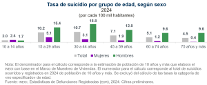 La tasa de suicidios fue de 2.6 por cada 100 mil mujeres y 11.2 por cada 100 mil hombres. Por grupos de edad, el de 30 a 44 años presentó la tasa más más alta (10.7), seguido por el de 15 a 29 años (10.2). Entre las mujeres, la tasa más elevada se observó en los grupos de 15 a 29 años (5.1) y en el de 30 a 44 años (3.1). En los hombres, la mayor tasa correspondió al grupo de 30 a 44 años (18.8), seguida por la del grupo de 15 a 29 años (15.4).