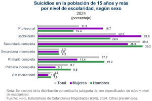 Respecto al nivel de escolaridad de la población de 15 años y más, los porcentajes de suicidios más altos correspondieron a personas con secundaria completa (29.4 %) y bachillerato (22.5 %), mientras que las más bajas se registraron en quienes no contaban con escolaridad (3.6 %).